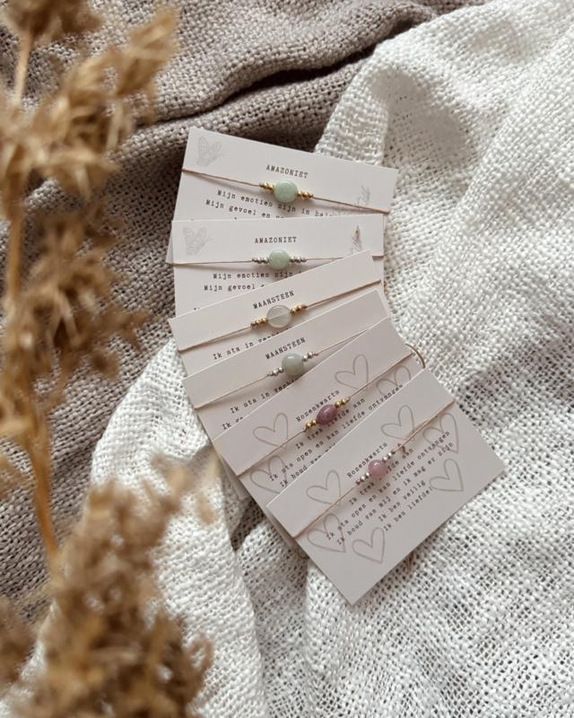 Zit verpakt om een kaartje waar de werking van het armbandje in affirmaties op staat.