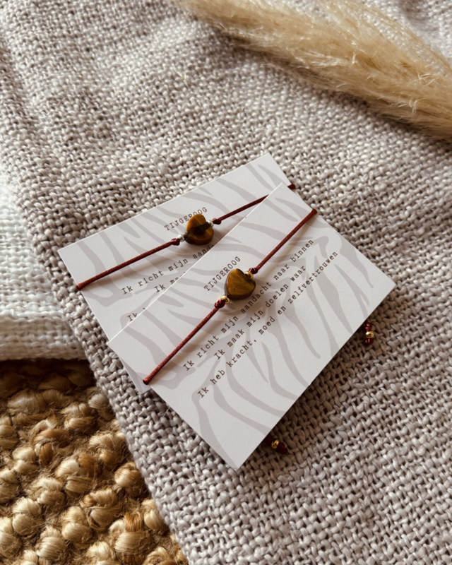 Tijgeroog hartje op satijnkoord - Roest